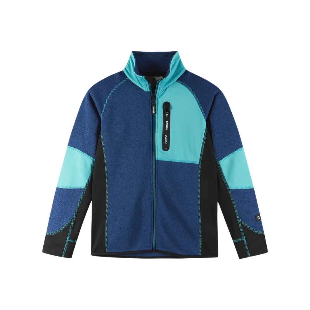 Reima Liukuen JR — детская кофта на молнии изготовлена на 90% из переработанных волокон. Ее ворсистая изнаночная сторона сохраняет тепло. Подойдет для занятий зимними видами спорта или повседневной носки для отдыха.