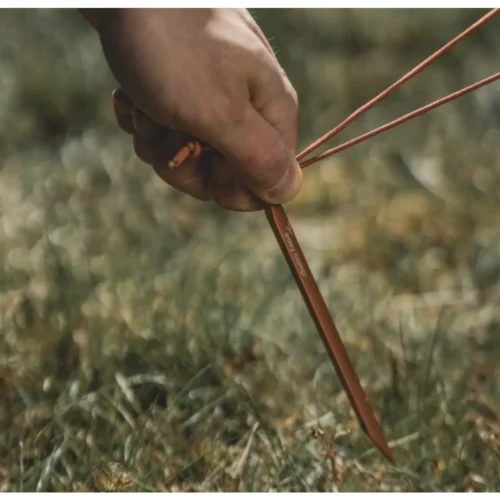 - Простота установки — острый наконечник позволяет легко вбивать колышек в землю вручную или с помощью походного молотка
