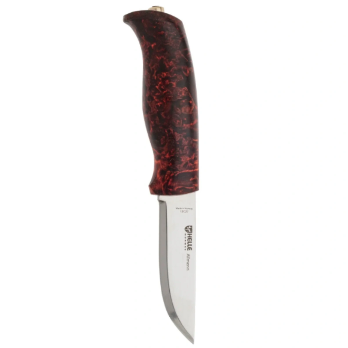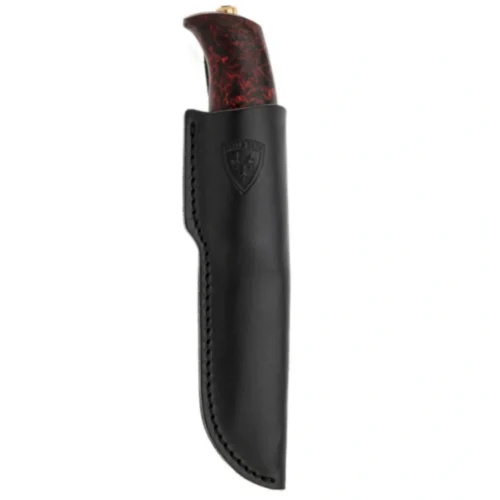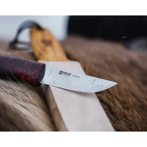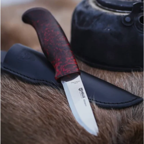 Helle Allmenn — это универсальный нож с фиксированным клинком, созданный для самого широкого круга задач. Эргономичная рукоять из карельской березы окрашена в насыщенные красно-черные тона, что создает уникальный «пламенный» рисунок. Клинок с традиционной скандинавской заточкой (Scandi Grind) выполнен из нержавеющей стали Alleima 12C27, которая отлично держит заточку и легко правится в походных условиях. Нож комплектуется традиционными ножнами из натуральной черной кожи.