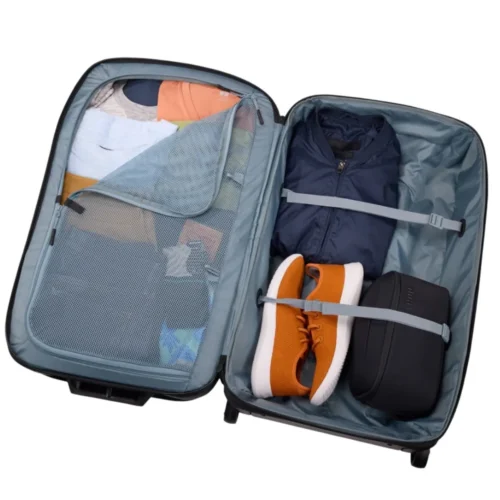 - Широкое отверстие позволяет легко укладывать вещи, а внутренние сетчатые карманы помогают отделить чистую одежду от грязной