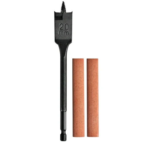 - Комплектация — плоское сверло, два точильных камня, чехол