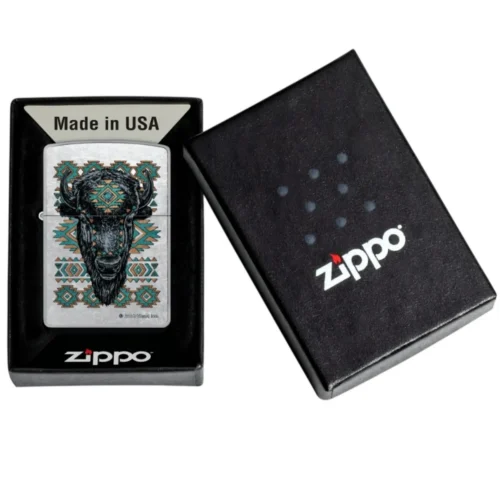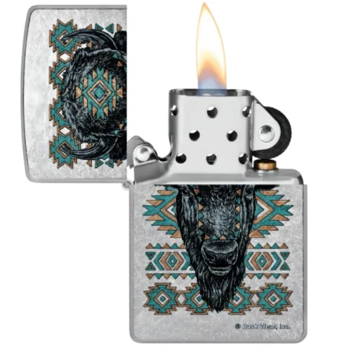 Zippo 207 Buck Wear BW-KR-1664431 — это оригинальная ветрозащитная зажигалка, созданная в сотрудничестве с брендом Buck Wear™, который специализируется на одежде для охотников и любителей аутдора. На лицевой стороне зажигалки изображен величественный бизон на фоне американского флага, выполненный в винтажном стиле. Основой служит корпус с покрытием Street Chrome, которое имеет характерные «потертости», скрывающие царапины и следы использования.