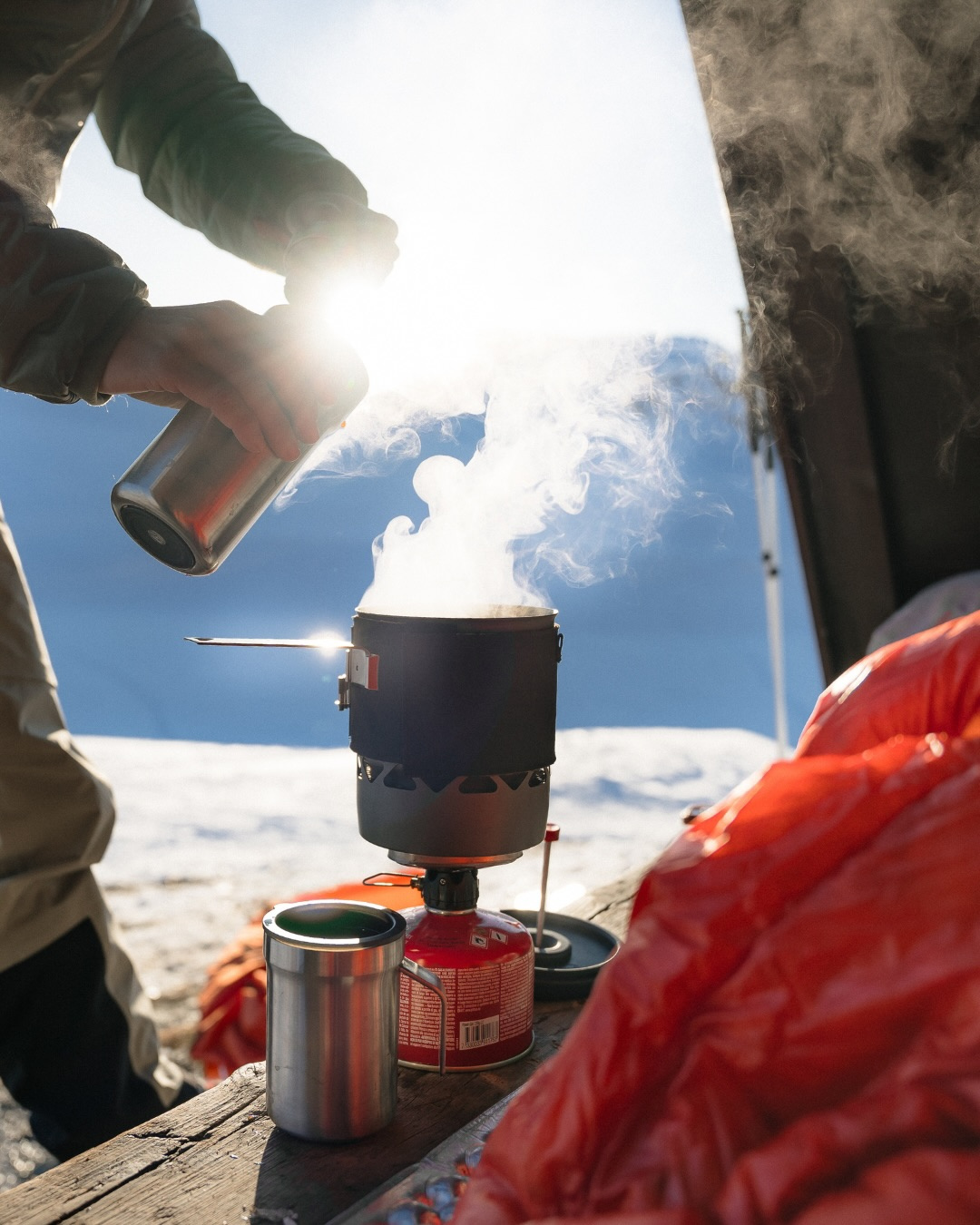 Палатка – зимняя модель: с юбкой от снега, усиленным каркасом от ветра, хорошей вентиляцией, чтобы конденсат не капал на спальник. Ставь её на утрамбованный снег или выкопай яму для ветрозащиты.