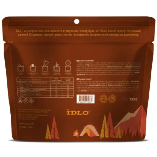 IDLO — это молодой украинский бренд из Черновцов, который занимается изготовлением блюд из сухих продуктов. Главной целью компании является накормить внутреннего зверя, который «просыпается» внутри нас при чувстве голода в самый неподходящий момент. Для этого стоит только добавить кипятка, перемешать, подождать буквально несколько минут, и вы сможете смело лакомиться своим блюдом в офисе, на отдыхе, в горах или на рыбалке, в дальней поездке на автомобиле. Блюда, изготовленные методом сушки натуральных продуктов без использования консервантов и ГМО, сохраняют в себе все полезные витамины. А малый вес порций является главным преимуществом в походах, особенно в дальних. Таким образом сублимированная еда от IDLO станет отличным спутником в любом путешествии!