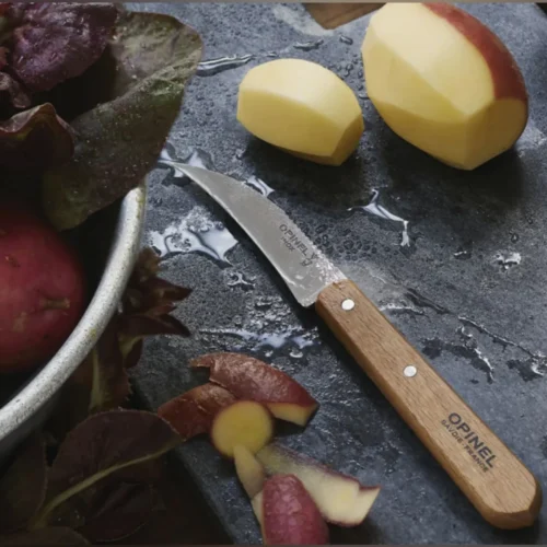 Cuțitul Opinel №114 Vegetable Beech — e dotat cu o lamă curbată de 7 cm și un tăiș zimțat pe spate, fiind conceput special pentru curățarea și pregătirea rapidă a legumelor și fructelor. Forma sa ergonomică permite o precizie sporită, în timp ce mânerul din lemn de fag oferă confortul clasic Opinel, transformând sarcinile migăloase din bucătărie într-o activitate plăcută.