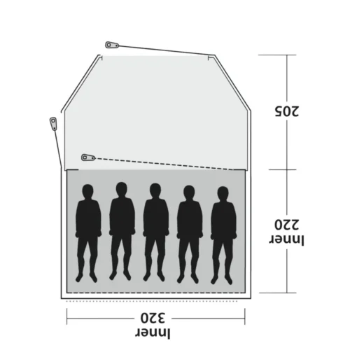- Vestibul practic — podeaua detașabilă de tip cuvă (bathtub groundsheet) protejează zona de zi de umiditate și murdărie, iar marginile acesteia pot fi pliate la nivelul solului la intrare pentru a evita împiedicarea.
